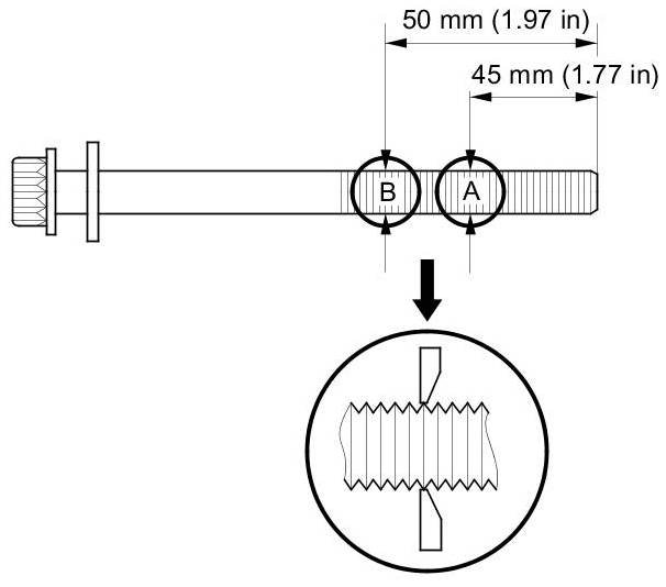 If either diameter is less than 10.6 mm (0.417 in), replace the bolt