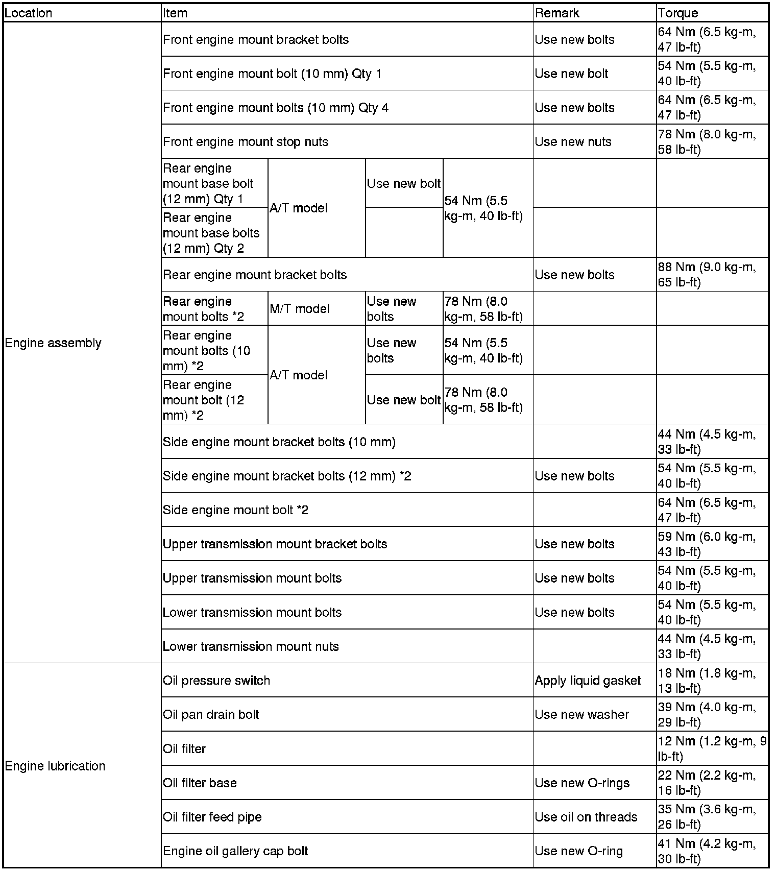 *Refer to each S/M section for the bolts/nuts not indicated here.
