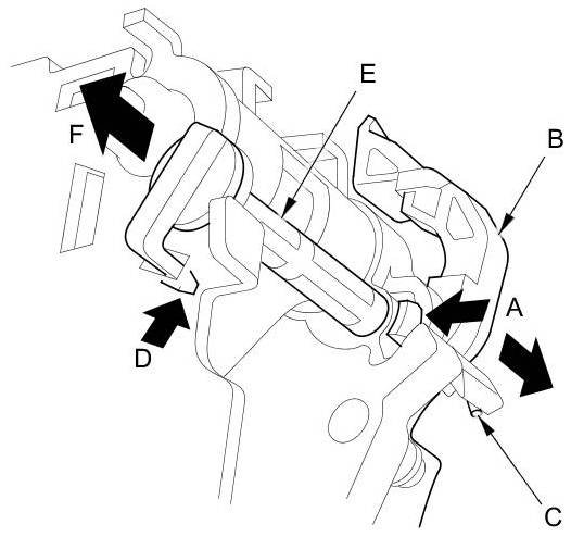 3. Release the lock tab (D) of the release shaft (E), and remove the release shaft (F).