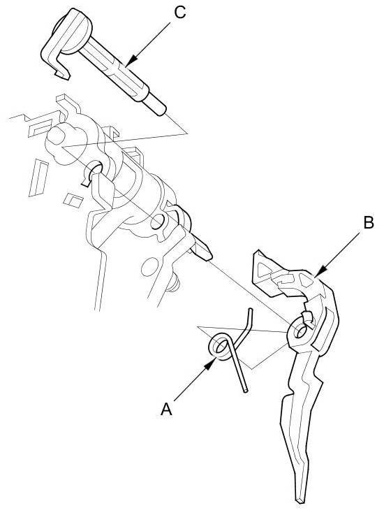 6. Install the release shaft (C) in the shift lever, and install the shift lock release and the release spring on the release shaft end.