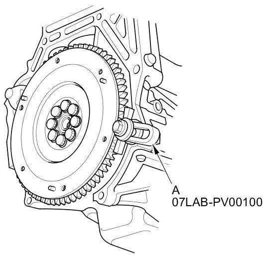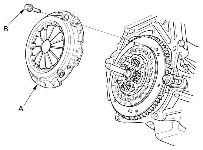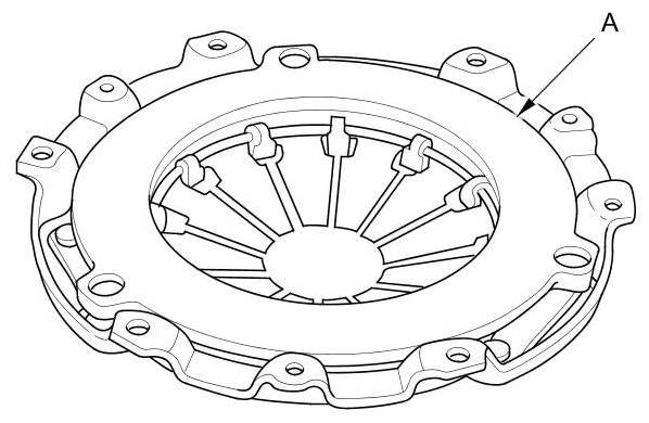 28. Torque the pressure plate mounting bolts (A) in a crisscross pattern. Tighten the bolts in several steps to prevent warping the diaphragm spring. Make sure that there is no clearance between the pressure plate and the flywheel.