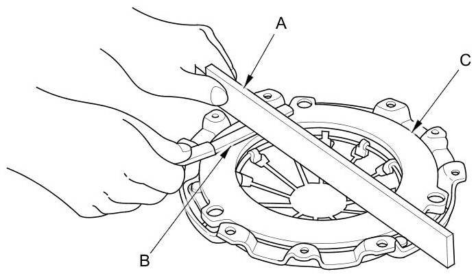 7. Inspect for warpage using a straight edge (A) and a feeler gauge (B). Measure across the pressure plate (C). If the most measurement difference is more than the service limit, replace the pressure plate.