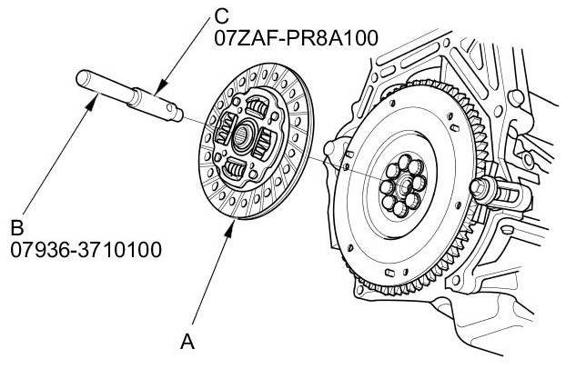 8. Remove the clutch disc (A), the remover handle (B), and the clutch alignment shaft (C).