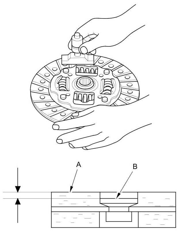 11. Measure the depths of the rivets from the clutch disc lining surface (A) to the rivets (B) on both sides. If the measurement is less than the service limit, replace the clutch disc.