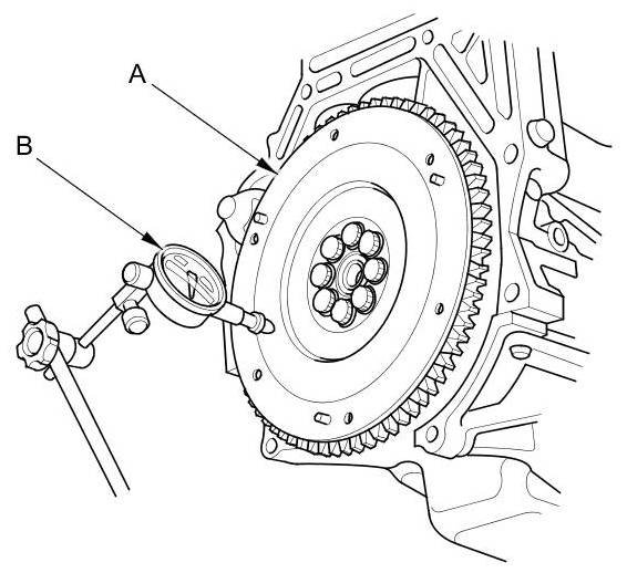 15. Measure the flywheel (A) runout using a dial indicator (B). Through at least two full turns with pushing against the flywheel each time you turn it to take up the crankshaft thrust washer clearance. If the measurement is not within the standard, replace the flywheel, and recheck the runout; go to step 16.