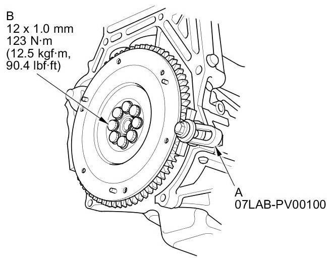19. Install the ring gear holder (A), then torque the flywheel mounting bolts (B) in a crisscross pattern in several steps.