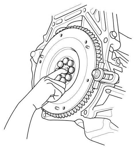 17. Loosen the flywheel mounting bolts in a crisscross pattern in several steps. Remove the bolts, then remove the flywheel and the ring gear holder.