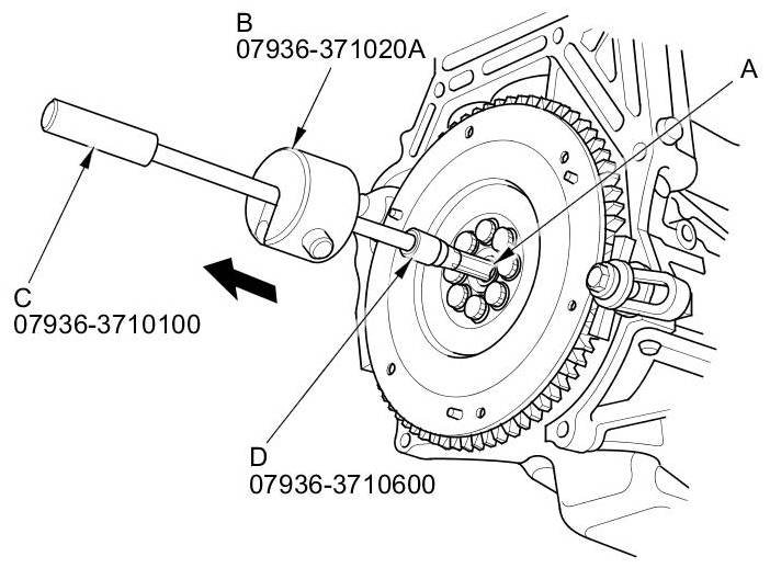 22. Remove the crankshaft pilot bushing (A) using the slide hammer (B), the remover handle (C), and the 20 mm bearing remover shaft set (D).
