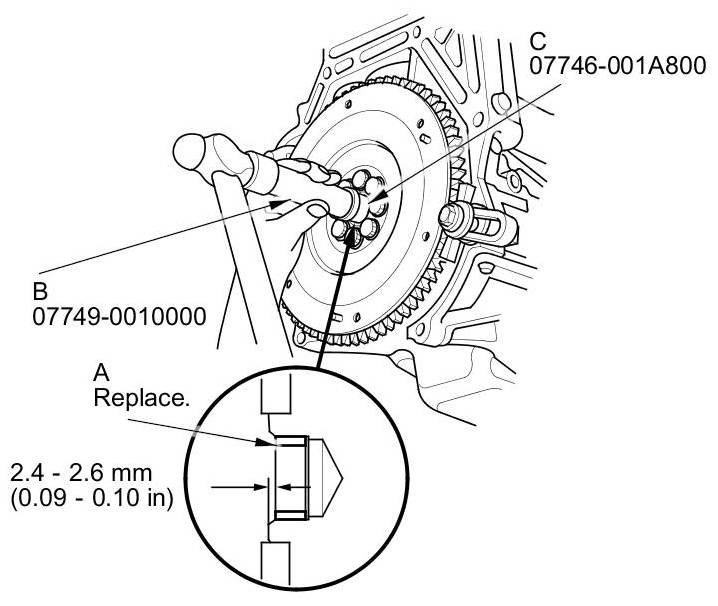 23. Install a new crankshaft pilot bushing (A) into the crankshaft using the 15 x 135L driver handle (B) and the 22 x 24 mm attachment (C).