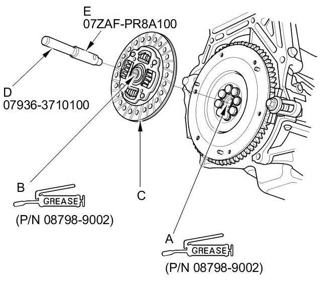 26. Apply super high temp urea grease (P/N 08798-9002) to the splines (B) of the clutch disc (C), then install the clutch disc using the remover handle (D) and the clutch alignment shaft (E).