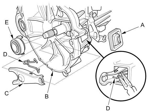 3. Remove the release fork (C) from the clutch housing by squeezing the release fork set spring (D) with pliers. Remove the release bearing (E).