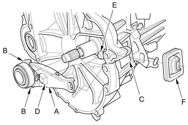 8. Install the release fork boot (F). Make sure the boot seals around the release fork and the clutch housing.