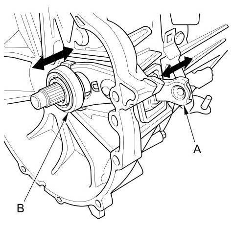 9. Move the release fork (A) right and left to make sure that it fits properly against the release bearing (B) and that the release bearing slides smoothly. Wipe off any excess grease.