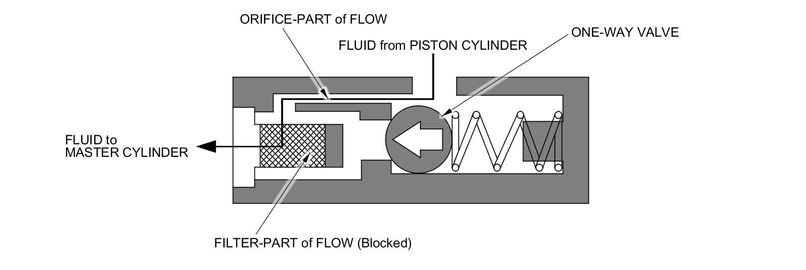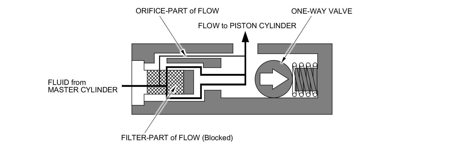When the clutch pedal is pressed, the fluid pressure from the master cylinder moves the one-way valve in the direction shown in the illustration. The fluid flows through two passages: the orifice-part and the filter-part. It then flows out to the piston cylinder to release the pressure plate and the clutch disc joint.