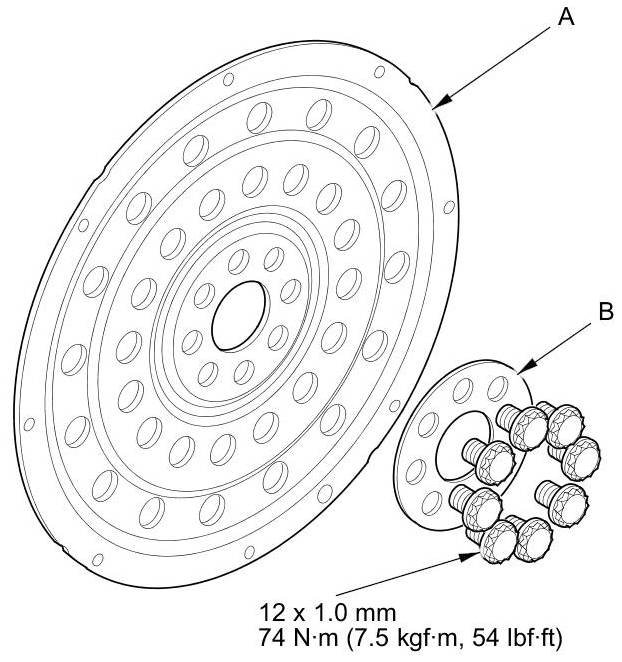 2. Remove the drive plate (A) and the washer (B) from the engine crankshaft.