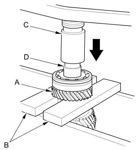 3. Support 6th gear (A) on steel blocks (B), then use a press (C) and an attachment (D) to press the countershaft out of the ball bearing and 6th gear.