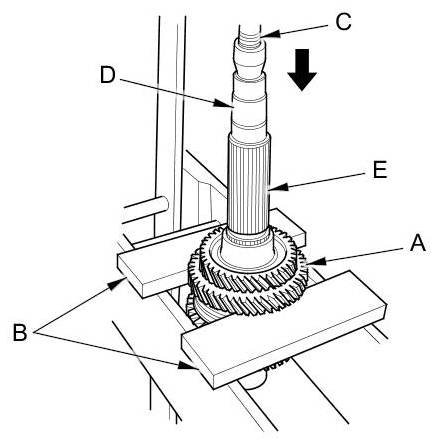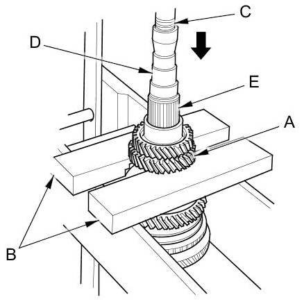 5. Support 4th gear (A) on steel blocks (B), then use a press (C) and an attachment (D) to press the countershaft (E) out of 4th gear and 5th gear.