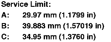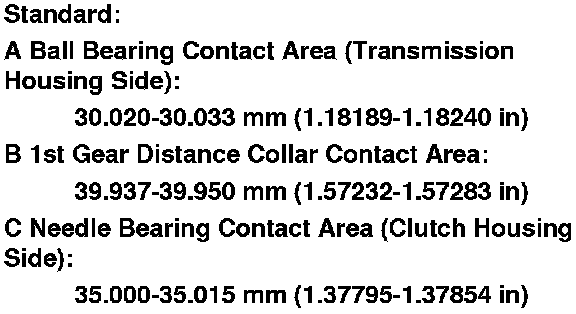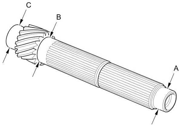 1. Inspect the gear and bearing contact areas for wear and damage, then measure the countershaft at points A, B, and C. If any part of the countershaft is less than the service limit, replace it.