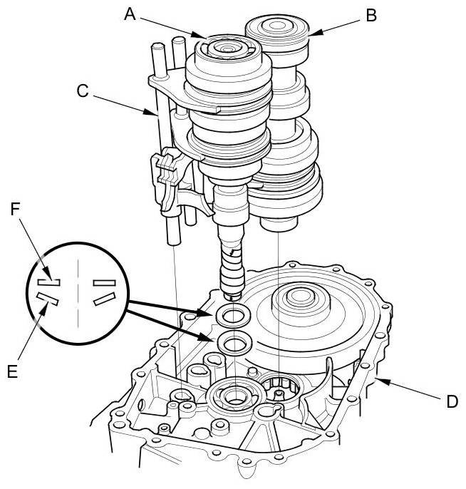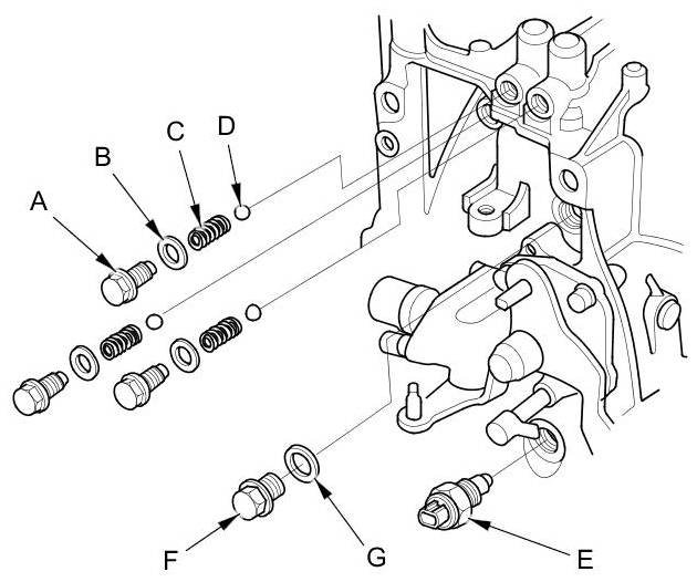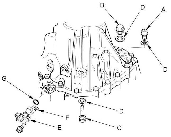 6. Remove the output shaft (countershaft) speed sensor (E), the plain washer (F), and the O-ring (G).