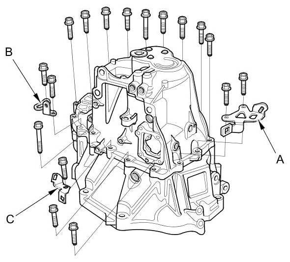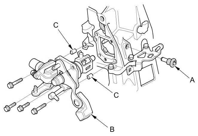 7. Loosen the 8 mm flange bolts in a crisscross pattern in several steps, then remove them with transmission hanger A, transmission hanger B, and the harness bracket (C).
