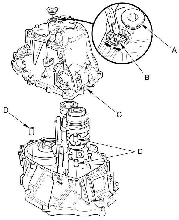 9. While expanding the 72 mm snap ring (B) on the countershaft ball bearing with snap ring pliers, lift the transmission housing (C). Release the snap ring pliers, and remove the transmission housing and the three 14 x 20 mm dowel pins (D).