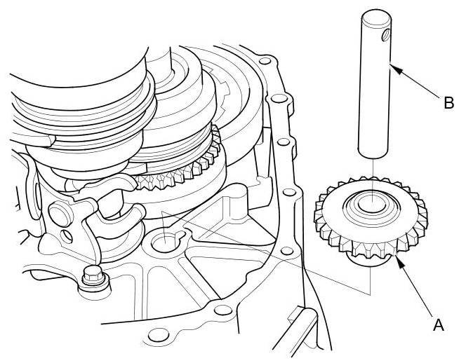 11. Remove the reverse idler gear (A) and the reverse idler gear shaft (B).