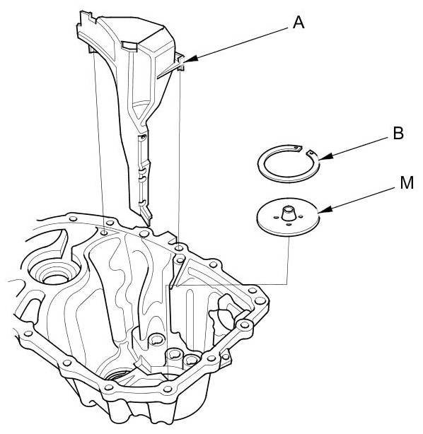 16. Remove the oil gutter plate (A), the 72 mm shim (B), and oil guide plate M.
