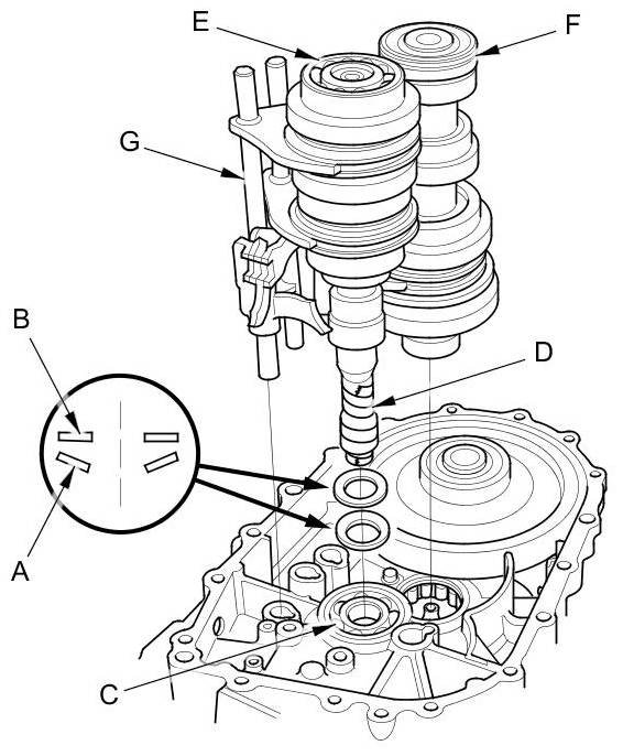 3. Apply tape to the mainshaft splines (D) to protect the seal. Install the mainshaft assembly (E) and the countershaft assembly (F) with the shift fork assembly (G), as an assembly.