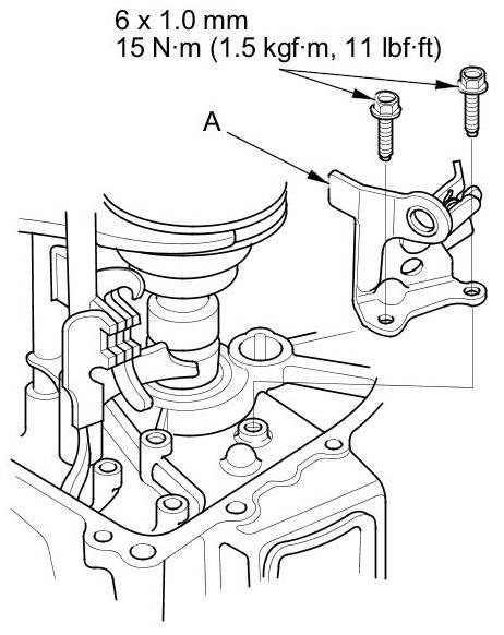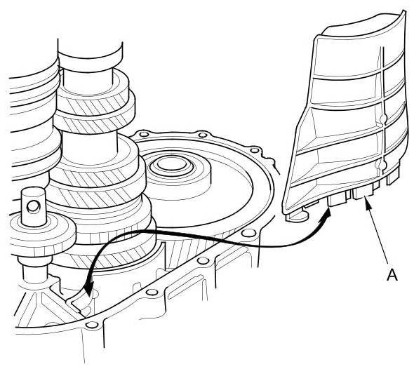 13. Make sure the 72 mm snap ring (A) is securely seated in the groove of the countershaft bearing.
