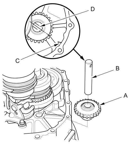 5. Install the reverse idler gear (A) and the reverse idler gear shaft (B) by aligning the mark (C) on the clutch housing with the reverse idler gear shaft hole (D).