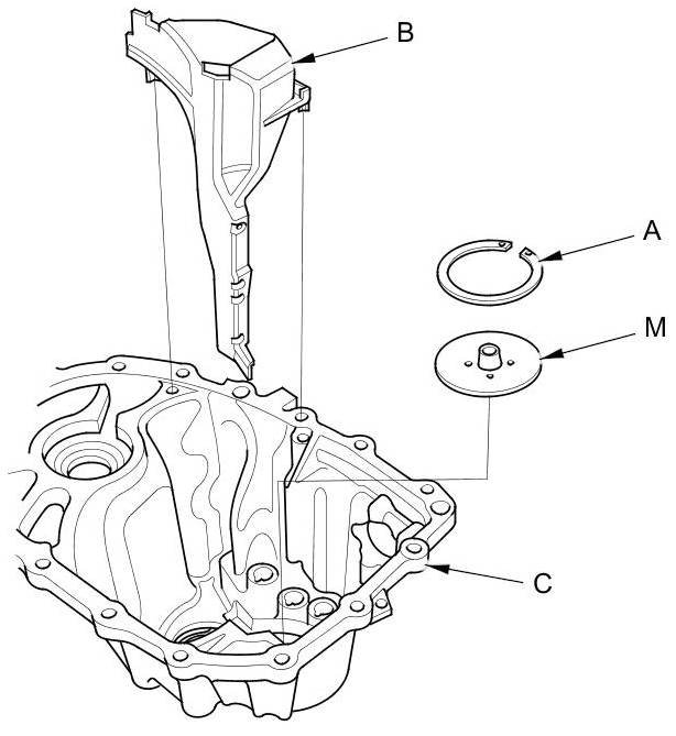 7. Select the proper size 72 mm shim (A) according to the measurements made during the Mainshaft Thrust Clearance Adjustment M/T Main Shaft Thrust Clearance Adjustment. Install the oil gutter plate (B), oil guide plate M, and the 72 mm shim into the transmission housing (C).