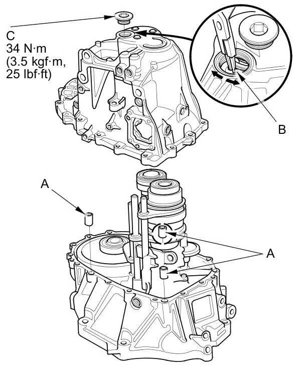 20. Apply liquid gasket (P/N 08717-0004, 08718-0001, 08718-0012, 08718-0003, 08718-0004, or 08718-0009) to the threads of the interlock bolt (C), and install it on the transmission housing.