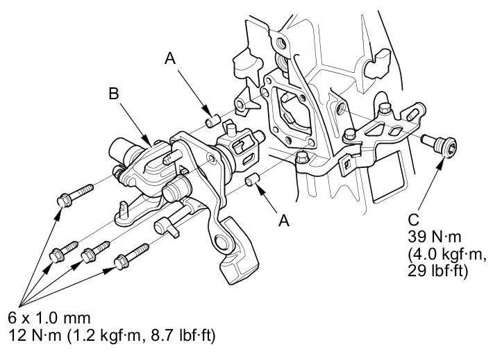 15. Install the 8 mm flange bolts finger-tight with transmission hanger A, transmission hanger B, and the harness bracket (C).