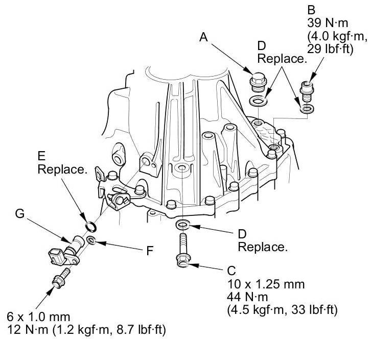 22. Apply MTF to a new O-ring (E), then install the O-ring, the plain washer (F), and the output shaft (countershaft) speed sensor (G).