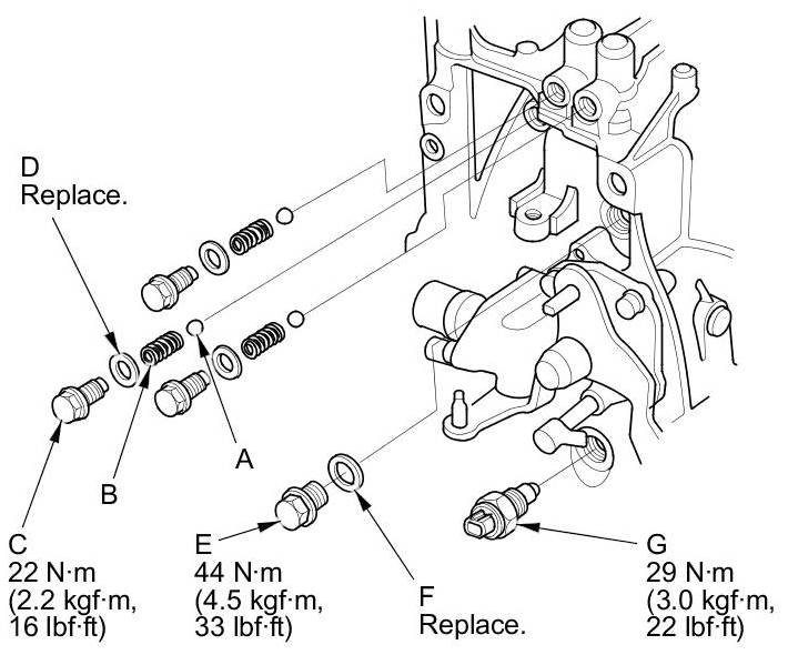 23. Install the steel balls (A), the detent ball springs (B), and the detent bolts (C) with new 12 mm sealing washers (D).