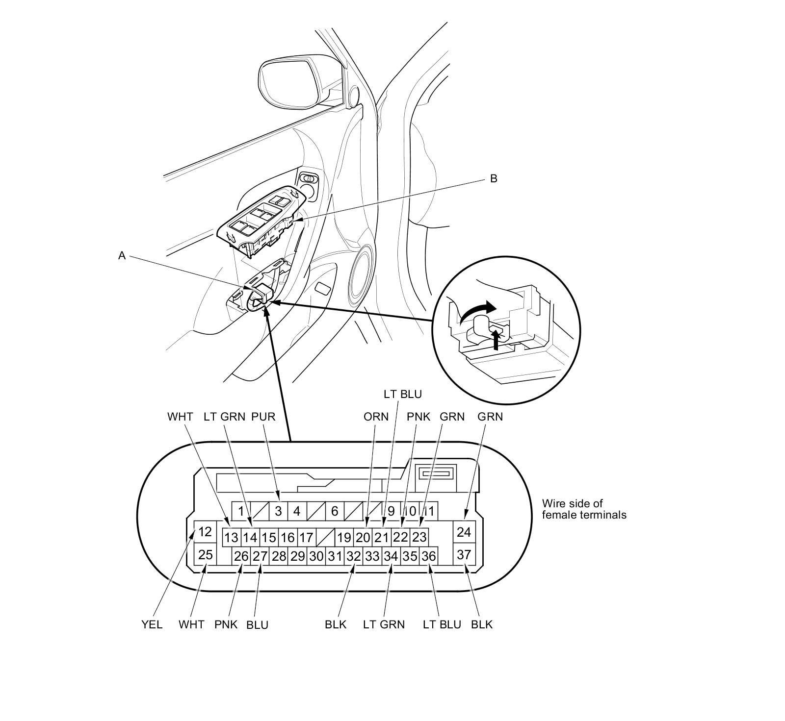 3. Disconnect the 37P connector (A) from the power window master switch (B).