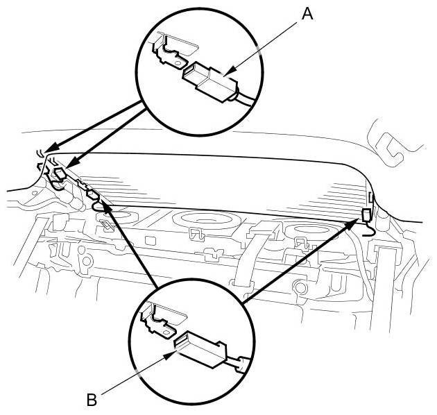 2. Disconnect the window antenna terminals (A) and the rear window defogger terminals (B).
