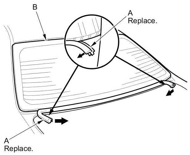 14. Attach the fasteners with the adhesive tape to the rear window opening flange (A) of the body on both sides.