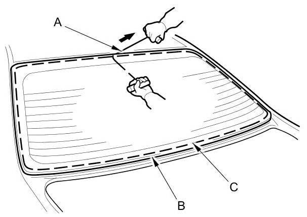 7. With a helper on the outside, pull the piano wire (A) back and forth in a sawing motion. Hold the piano wire as close to the rear window (B) as possible to prevent damage to the body, and carefully cut through the adhesive (C) around the entire rear window.