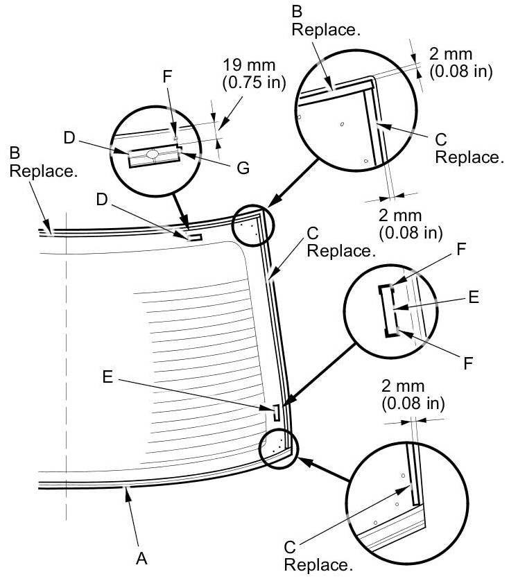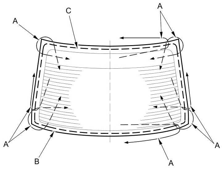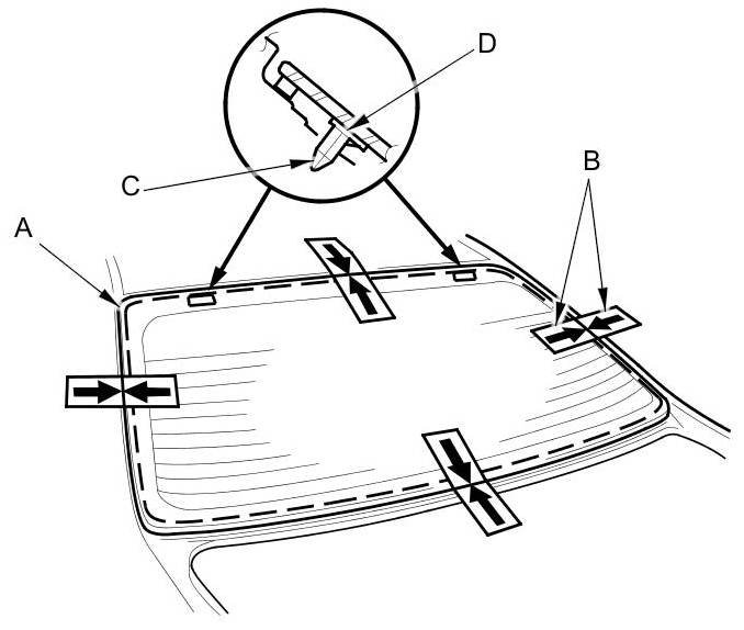 12. Apply glass primer to the edge of the rear window (A) where the new lower rubber dam (B) will be attached as shown. Attach the rubber dam with the adhesive tape (C) to the lower edge of the rear window: