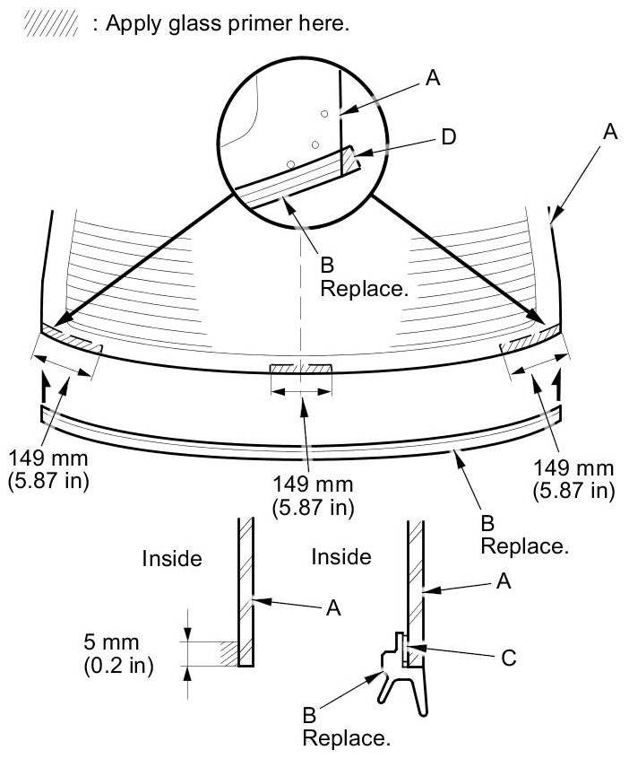 - Apply glass primer to the corner area of the rear window using the printed dots (C) on the rear window as a guide.