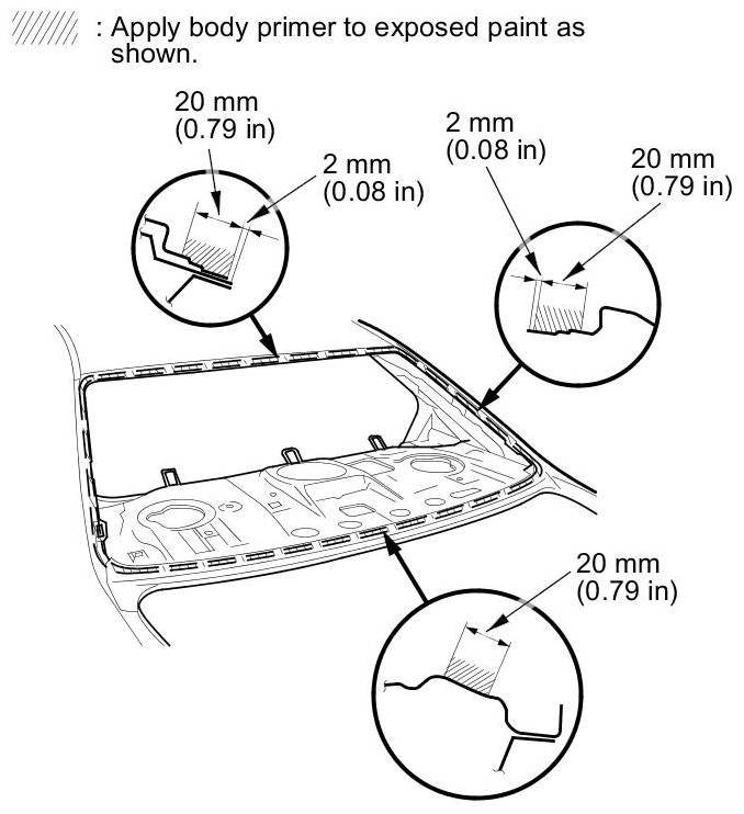 18. Carefully apply a light coat of body primer to any exposed paint or metal around the flange where the new adhesive will be applied. Let the body primer dry for at least 10 minutes: