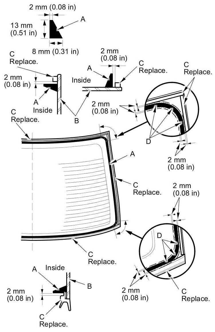 20. Put the cartridge in a caulking gun, and run a continuous bead of the adhesive (A) to the rear window (B) along the edge of the rubber dams (C) as shown: