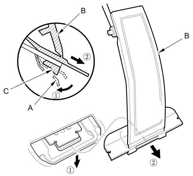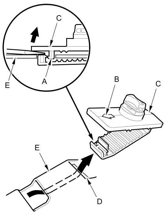 10. If necessary, release the hook (A) that is just under the arrow mark (B) on the floor mat holder (C) by prying the holder with a flat-tip screwdriver, and remove the holder through the slit (D) in the carpet (E).