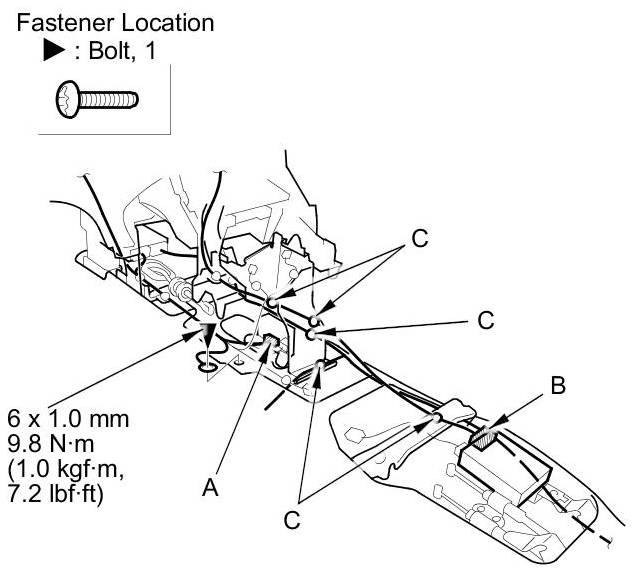6. Disconnect the yaw rate-lateral acceleration sensor connector (A) and the USB adapter unit connector (B), and detach the wire harness clips (C). Remove the ground bolt with a TORX T30 bit.