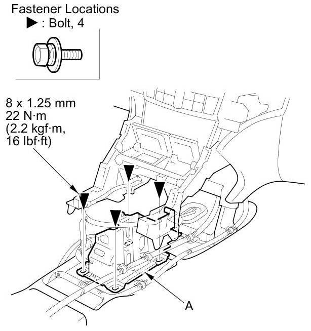 7. Remove the bolts, then remove the shift lever mount bracket (A).