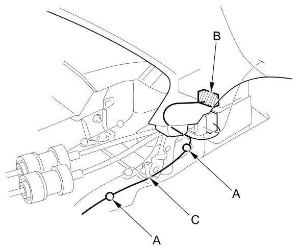 4. While pushing down the back-up spring (A), pull back the accelerator pedal (B) to release the hook (C).