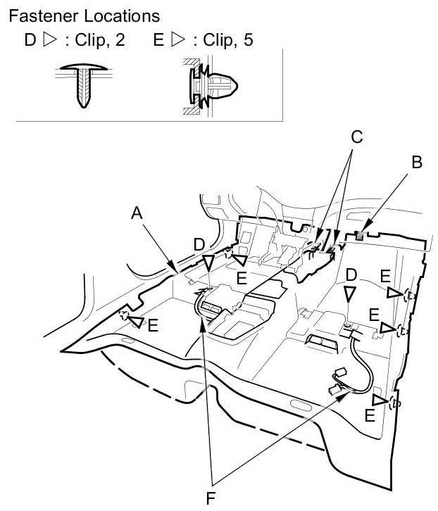 3. Detach the clips (E) fastening the carpet to both door sill areas.