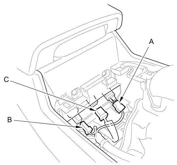 2. Disconnect the console accessory power socket connector (A), the auxiliary jack assembly connector (B), and the USB jack connector (C).