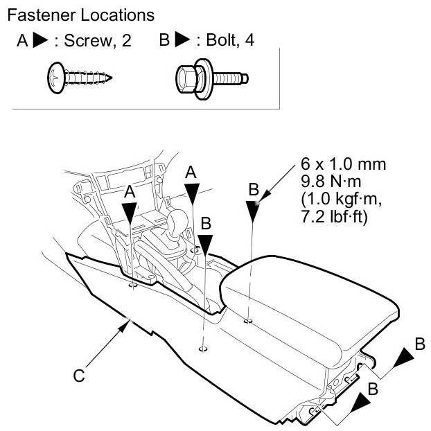 3. Remove the screws (A) and the bolts (B) securing the center console (C).